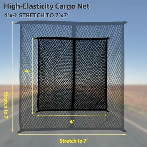 - Highly elastic, stretches from 4' x 4' to 7' x 7', accommodating various cargo sizes.